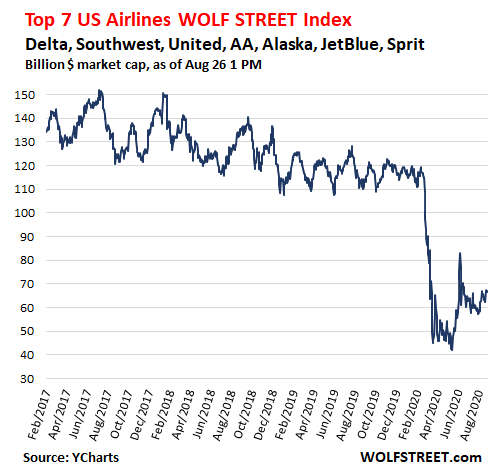 Despite the huge rally in stocks since March 23, airlines stocks have not recovered anywhere near the levels of the Good Times. The WOLF STREET index of the seven largest US airlines – Alaska, American, Delta, JetBlue, Southwest, Spirit, and United – is still down 45% from the already beaten-down level at the end of the Good Times in mid-January 2020, and down more from prior years (market cap data via YCharts):
