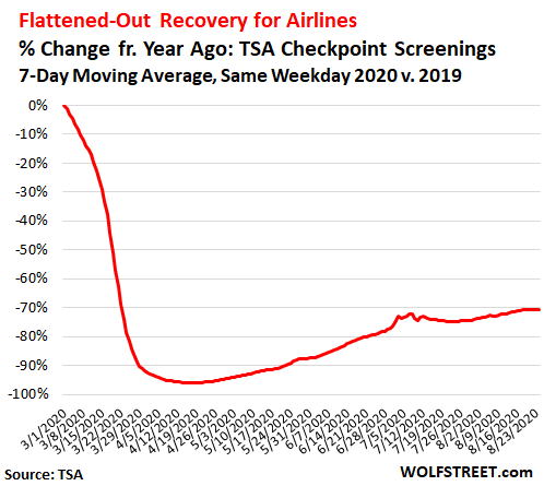 The air passenger business is still down roughly 70% in the US, six months after the initial collapse of traffic began, according to TSA airport screenings of air travelers entering into security zones. And demand has hardly improved any since early July, and airlines continue to slash costs and cash-burn to survive: