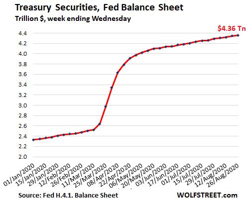 Since mid-May, the Fed has increased its Treasury holdings in a range between $6 billion and $29 billion a week, following the 10-week period, starting in mid-March, when it had gone hog-wild, buying at the peak $362 billion in the week ended April 1: