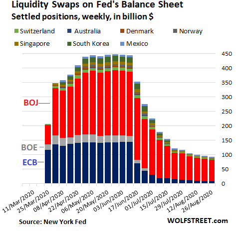 The Fed’s swap lines, by which it provides dollars to certain other central banks, fell by $4 billion to $92 billion, from a peak of $448 billion in early May. The Bank of Japan accounts for 81% ($75 billion) of the total. Swaps with the ECB fell to $7 billion. Swaps with the Bank of Mexico have been unchanged since the beginning of July, at $5 billion. The central banks of Switzerland and Singapore had small balances left. The rest were gone: