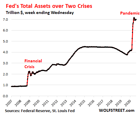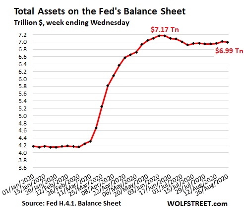 Total assets on the Fed’s balance sheet for the week ended August 26, released this afternoon, fell by $20 billion, to $6.99 trillion, after two weeks in a row of increases, which had followed two weeks in a row of declines, which had followed two weeks in a row of increases, which had followed four weeks in a row of declines. Two steps forward, two steps back — the Fed’s new song and dance? With the effect that total assets are now down by $179 billion from their peak on June 10: