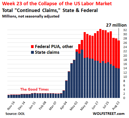 It’s still a historically catastrophic number, but it’s the least catastrophic number since mid-May: 27.02 million people (not seasonally adjusted) continued to claim unemployment insurance under all state and federal programs, down by 1.04 million from the prior week, according to the Department of Labor this morning.