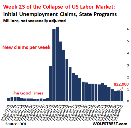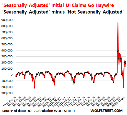 During the early weeks of the collapse of the US labor market, it became clear to me that seasonal adjustments were exaggerating unemployment claims. So with the UI report on May 28, I switched to discussing only “not seasonally adjusted” unemployment claims. Today, in a special note, the Labor Department explained that my hunch was correct, and why it was correct, and that it would change its method starting in September.
