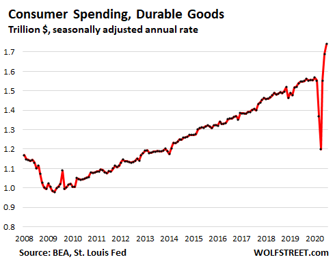 Consumers forked over a record amount for durable goods, $1.74 trillion (annual rate) in July, up by 12.2% from February and by 12.6% from July 2019. This includes a surge in spending on laptops and other electronic equipment needed for working, teaching, and studying at home: