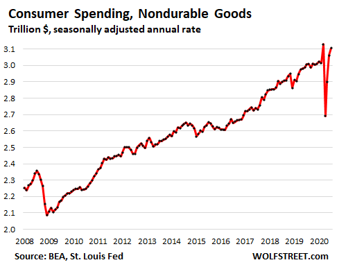 Consumers splurged at near-record pace on nondurable goods, $3.10 trillion (annual rate), up 3% from February but down a tad from the record set in March, when they cleaned out supermarkets down to bare shelves, ranging from pasta to toilet paper. This was followed by a plunge, and now back to Pandemic normal, where people eat at home, work at home, study at home, and teach their kids at home, which shifts purchases from businesses and schools to households, and therefore to consumer spending: