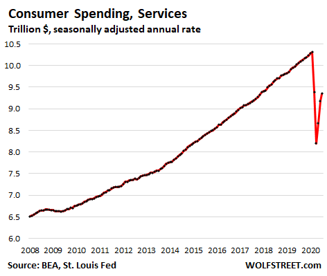 But consumers scrimped on services. At $9.35 trillion (annual rate), spending on services was down 9.3% from February. Even during the Financial Crisis, spending on services barely dipped. But this time it plunged, and it has recovered only to a level where it had first been in late 2017.
