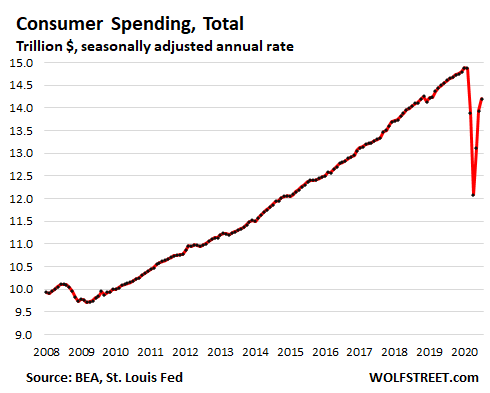 Total consumer spending in July, at $14.2 trillion (annual rate), slowed its recovery, ticking up by 1.9% from June, and was still down, despite all this stimulus money, by 4.6% from February: