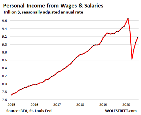 Personal income from wages and salaries alone, while ticking up from June to $9.2 trillion (annual rate), was still down 5.0% from pre-Pandemic February: