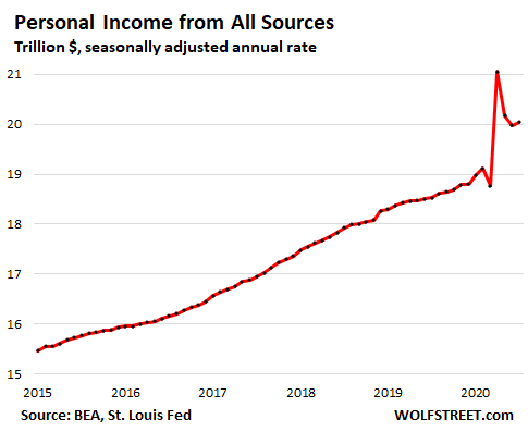 Personal income from all sources in July, including stimulus and the extra $600 a week in unemployment benefits, but also rental income, dividend income, etc. – but not stock market gains – ticked up 0.4% from June to a seasonally adjusted annual rate of $20.04 trillion. This was down from the spike in April caused by the stimulus checks, but was still up by 4.8% from February and by 8.2% from July last year.