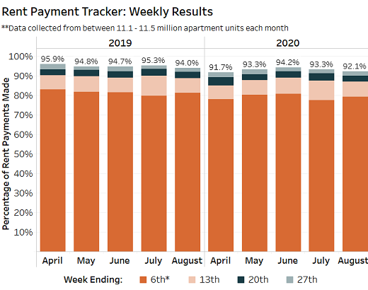 - By Aug 27: 92.1% of rent payments made, down by 1.9 percentage points from Aug 27, 2019 (94.0%).