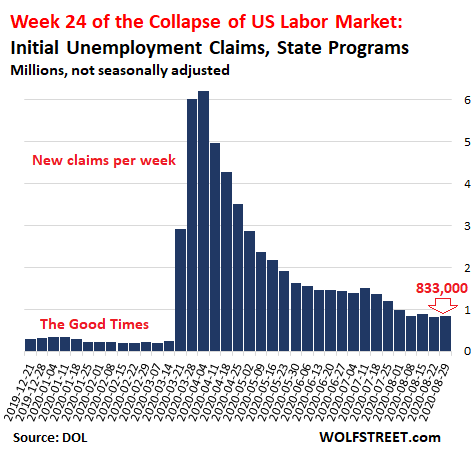 The Labor Department last week announced a major change in how it would figure “seasonally adjusted” unemployment claims because they’d gone rogue during this crisis. I stopped reporting “seasonally adjusted” claims in May for that very reason, and focused exclusively on “not seasonally adjusted” claims. So what you have seen here since May, and what you see here today, are “not seasonally adjusted” claims and they were not impacted by the Labor Departments Change (more in a moment):
