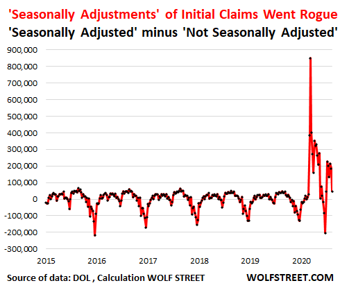 Just how rogue these seasonal adjustments had gone is demonstrated by this chart that shows the difference between “seasonally adjusted” initial claims and “not seasonally adjusted” initial claims. The difference should be in line with the seasonality of the labor market. The largest seasonal factor is the surge in unemployment claims in late December and January (the big dips in the chart), following the surge in hiring during the holiday shopping season. But during the current unemployment crisis, those adjustments went rogue: