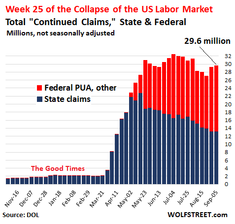 State plus federal PUA initial claims combined jumped to 1.70 million (not seasonally adjusted). These are people who’d newly lost their work and filed for UI during the week ended September 5, translating into a monthly rate of over 7 million people who are still losing their work and file for UI.