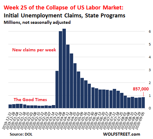 Two weeks ago, the Labor Department announced that it would correct “seasonally adjusted” unemployment-claims calculations because they’d gone rogue during this crisis. I stopped reporting “seasonally adjusted” claims in May for that reason, and reported exclusively “not seasonally adjusted” claims, and continue to do so, and none of the data I have reported since late May was impacted by that correction in calculation methods (here is my explanation of those changes and my chart that shows just how rogue these “seasonally adjusted” claims had gone; in the linked article, scroll down to “Data Chaos, Part 2”) .
