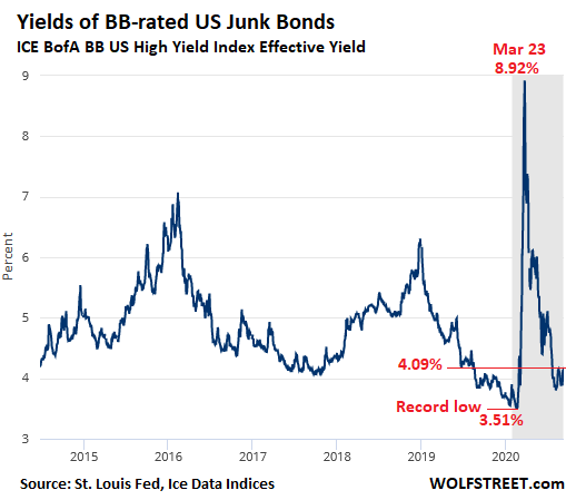 Since those heady days of early August, when the bond market was still under the illusion that the Fed would buy all these junk bonds, the average BB-rated yield – the high end of the junk-bond spectrum that qualifies for Fed purchases – has ticked up from around 3.80% on August 5 to 4.09% currently (ICE BofA BB US High Yield Index).