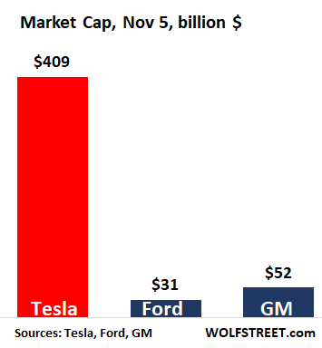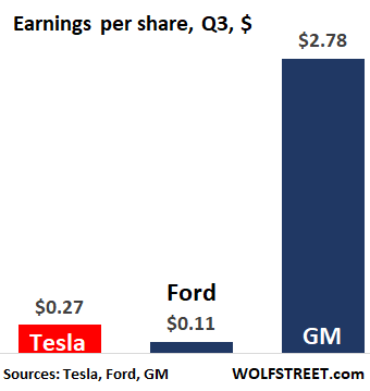 Earnings per share in Q3 at GM were over 10 times Tesla’s. Ford’s EPS were less than half Tesla’s:
