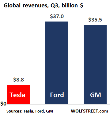 Global revenues at GM and Ford were over four times Tesla’s global revenues: