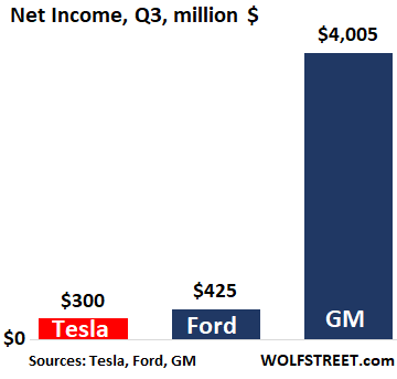 Net income attributable to common shareholders in Q3 at GM was 13 times Tesla’s; and Ford’s net income was 42% higher than Tesla’s: