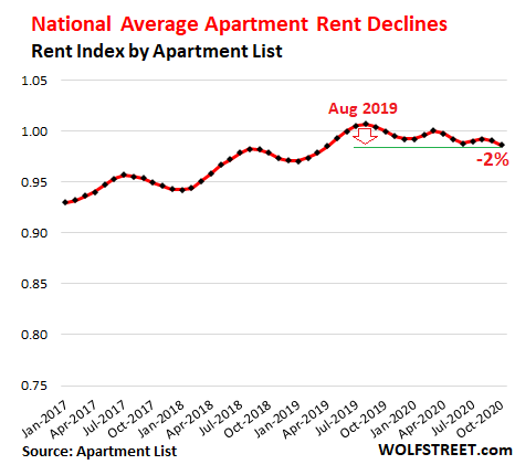 In terms of national apartment rents, the sharp declines in apartment rents in major markets has overpowered the rent increases in many smaller markets and has caused the national average rent to decline, according to Apartment List data. In October, it was down 1.4% year-over-year and 2% from August 2019: