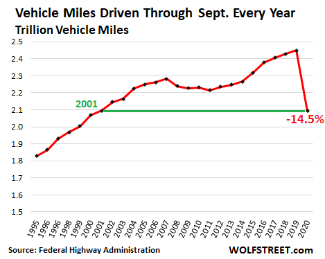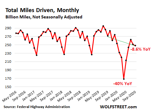 Total miles driven in September on all roads and streets in the US fell by 8.6%, or by 23.4 billion vehicle miles, compared to a year earlier, to 248.3 billion miles, according to the Federal Highway Administration on Friday. While that year-over-year decline is huge by historic standards, it’s the smallest year-over-year decline since the Pandemic started.