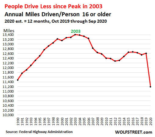 Miles driven per persons over 16 has been in a long-term decline since the peak in 2003 (at 13,400 miles), with a sharp drop-off during the Great Recession, and a half-baked recovery starting in 2014. In 2019, the miles driven per potential driver was down to 12,600 miles. Then came the Pandemic. Over the past 12 months through September – to approximate the year 2020 – miles driven per potential driver plunged to 11,200 miles, the lowest in decades: