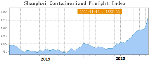 The freight rates that container carriers charge for shipping containers from Shanghai to the US West Coast has exploded to a new record of $3,871 per 20-foot-equivalent unit (TEU) in the week ended November 13, and to $4,676 per TEU to the US East Coast, according to the Shanghai Containerized Freight Index (SCFI), which tracks the spot rates of shipping containers from Shanghai on 13 major shipping routes. The index includes ocean freight rates and seaborne surcharges.