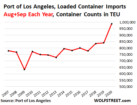The Port of Los Angeles reported that in September, imports of “loaded” containers (as opposed to “empty” containers, and we’ll get to those in a moment) jumped 17% year-over-year, to 471,794 TEU, after having jumped 18% year-over-year in August, to 516,285 TEU. September and August represent the peak of shipping season. The combined total of those two months reached nearly 1 million TEU, the highest ever for a two-month period. Note the difference between the Financial Crisis and the stimulus-powered Pandemic:
