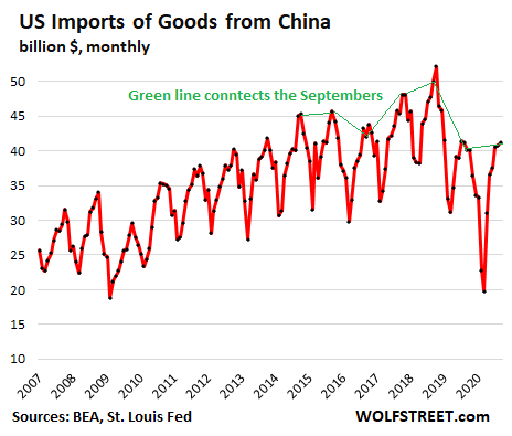 In September, US imports from China were up 2.6% from September 2019, though the remained down 17% from September 2018, down 9% from September 2017, down 2.5% from September 2016, etc. In fact, imports in September 2020, with the exception of last year, were the lowest for any September since 2013 in dollar terms: