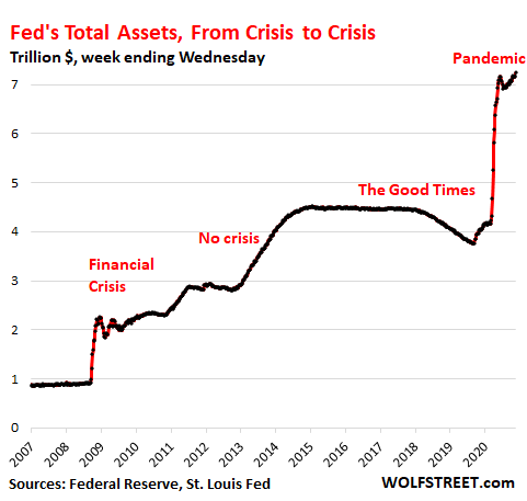 The Fed should have never been allowed to buy corporate bonds and corporate bond ETFs, which trade on the stock market. But it did so anyway for the first time ever. Back during the Financial Crisis, it should have never been allowed to buy mortgage-backed securities, but it did for the first time ever, and now it’s standard policy – and a $2-trillion line-item on the Fed’s balance sheet.