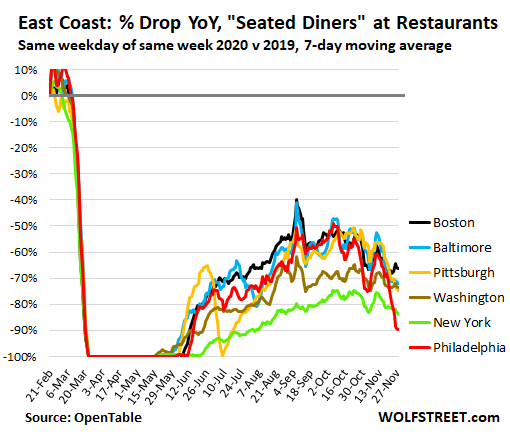 Renewed restrictions on indoor dining have been rippling across the cities on the East Coast. Hardest hit was Philadelphia where indoor dining ceased on November 20. Outdoor dining can continue. This caused the numbers of seated diners to plunge by 90% from a year ago (the highest reading had been at around -50% in early October). In Boston, the top of the batch, the number of seated diners was down 66% from a year ago:
