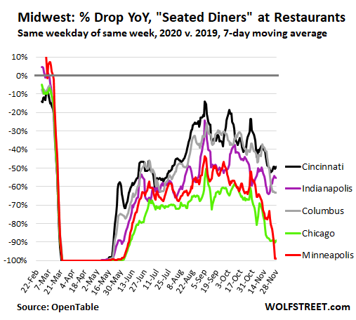 Minneapolis banned on-site consumption of anything indoors or outdoors, effective November 20, and the number of seated diners collapsed by 100% to zero. Chicago is under the Illinois order that banned indoor dining. The winter weather is largely banning outdoor dining. And the number of seated diners is down by 90%. Cincinnati is at the top, with seated diners down “only” 50%: