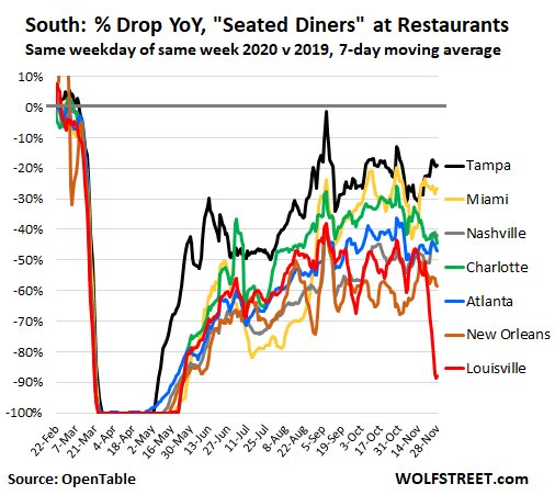 Louisville switched to outdoor dining only on November 20. Neither restaurants nor diners – and certainly not the weather, 38° F and rain in the forecast for tonight – were prepared for the switch. The number of seated diners collapsed by 88% from a year ago and from readings of around -50% a few weeks ago (red). Tampa is at the high end, with seated diners down just 19% from a year ago, followed by Miami (-27%):