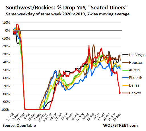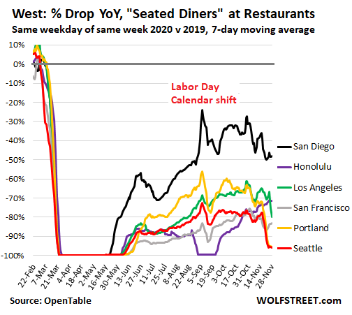 Half of the six cities in the West and Hawaii for which OpenTable provides data have closed all sit-down dining in recent days, including outdoor dining, and the number of seated diners has collapsed by nearly 100% from a year ago to near-zero in Portland (yellow) and Seattle (red) starting November 18, and in Los Angeles, starting effectively November 26.