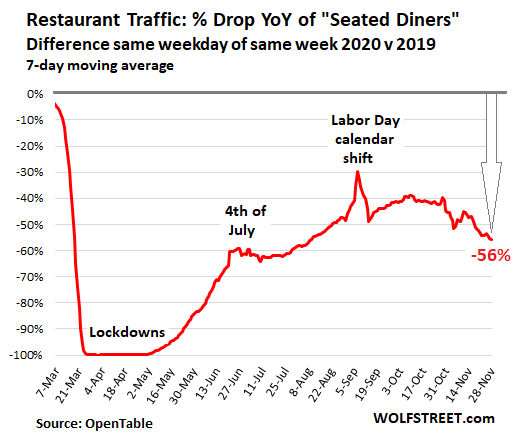 But in some cities, the “recovery” has been unwound to where it is revisiting the April-lockdown phase, with the restaurant business essentially shut down. Given the deterioration in recent days, and the ongoing surge of Covid, and the feared acceleration of infections following the holidays, many more restaurants will not make it through this phase.