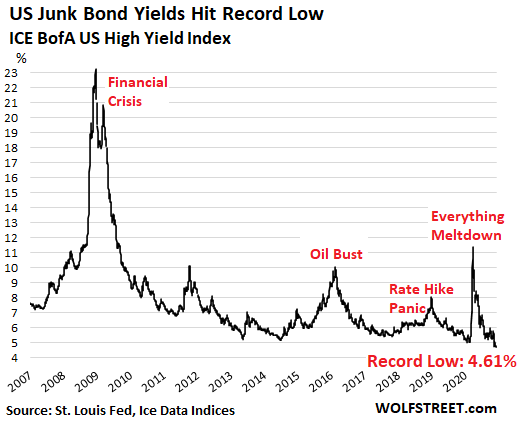 In September 2019, another corner of the credit market blew up, this time the repo market, and the Fed piled into repurchase agreements, in addition to another rate cut, to keep some big mortgage REITs and hedge funds that had massively borrowed in the repo market from imploding and spreading messy stuff around Wall Street. But the repo market blowout had not impacted the junk bond market, which watched from a distance. And by early 2020, junk-bond yields were in record-low territory.