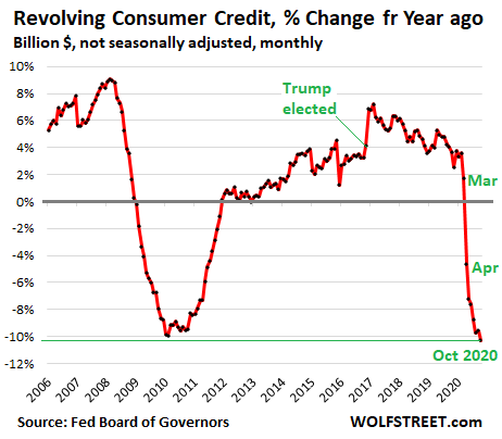 In October, credit card balances and other revolving credit ticked down again from the prior month, and plunged by 10.3% from October last year, the steepest year-over-year drop ever, eking past the peak year-over-year drop during the Financial Crisis (-9.9% in January and February 2010):