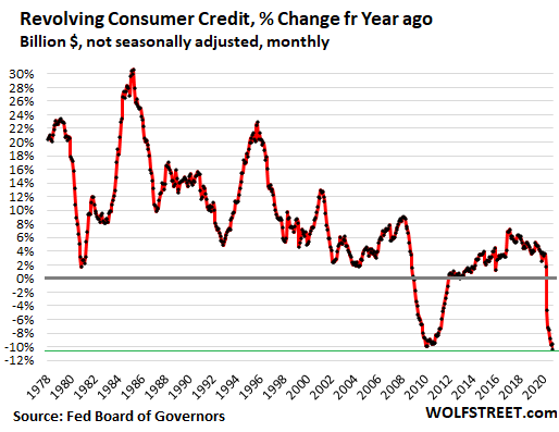Before the Financial Crisis, there had never been a year-over-year decline in revolving credit. For decades, Americans had been in the mode of piling on credit card debt with astounding passion and double-digit year-over-year surges in the early years, which allowed them to buy things and do things that they couldn’t otherwise afford, and it cranked up the US economy. The scheme lasted until the blowup during the Financial Crisis that caused the first-ever year-over-year decline. Now there’s the second year-over-year decline, and the steepest ever: