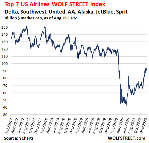 The airline lobbying group, Airlines for America, said on Monday when the bipartisan proposal was presented that it “enthusiastically” supported the $17 billion handout for the airlines. And airline stocks rallied. The WOLF STREET index of the top seven airlines in the US rose 2.4% today and is up 23% since mid-November: