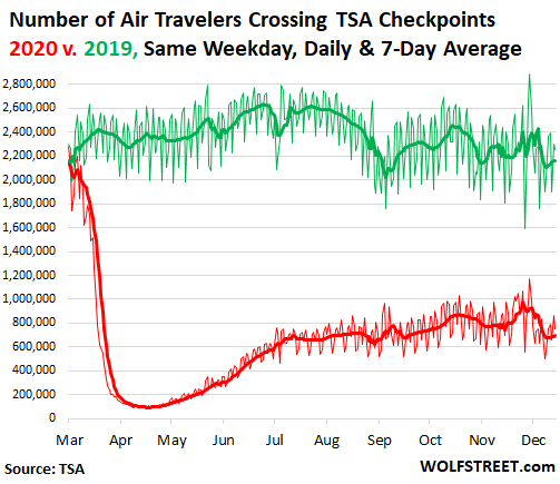 The number of passengers going through TSA checkpoints to enter the secured areas at US airports through December 14 has dropped sharply since late November. The chart shows the number of TSA checkpoint screenings in 2020 (red) and 2019 (green) per day (thin lines) and the seven-day moving averages (bold lines):