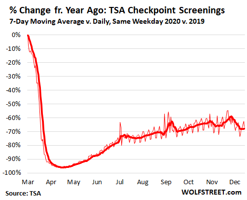 The daily checkpoint screenings are now down 68% (seven-day moving average) from where they’d been on the same day in the same week a year ago, the worst levels since early September: