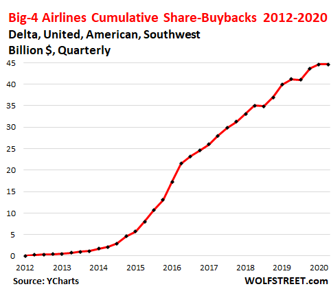 Top 4 airlines burned $45 billion on share buybacks since 2012. If airlines run out of money, Chapter 11 bankruptcy works. Airlines proved it.