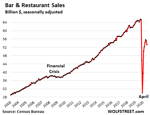 Sales at Restaurants & Bars fell 4.0% in November from October, to $53 billion (seasonally adjusted), and were down 19% from a year ago.