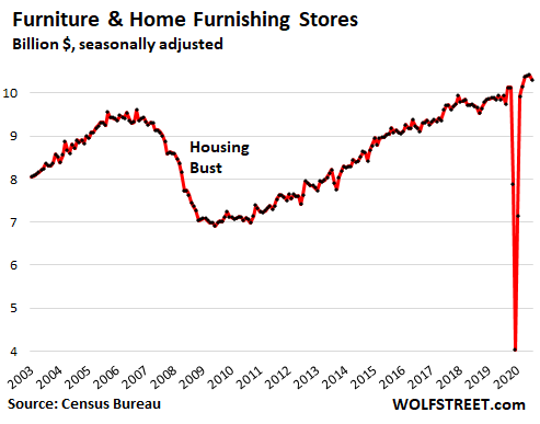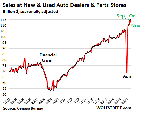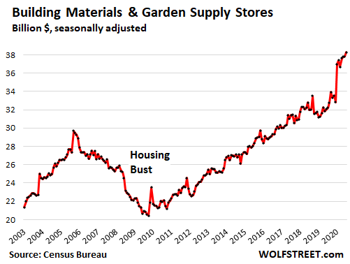 Sales at building materials, garden supply and equipment stores rose 1.1% in November from October, to a new record of $38 billion, and were up 19% year-over-year. Americans – contemplating staycations, backyard entertainment, work-from-home, and many other changes – have been sprucing up their homes, decks, and yards, and these stores have been booming: