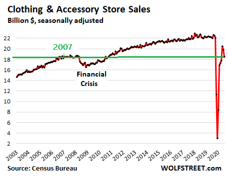 Then came the Pandemic, and even people who didn’t want to buy clothes online, ended up buying them online, figuring out that it works just fine. And as people were working from home, they didn’t need to buy work clothes. Sales in November dropped to where they’d first been in 2007: