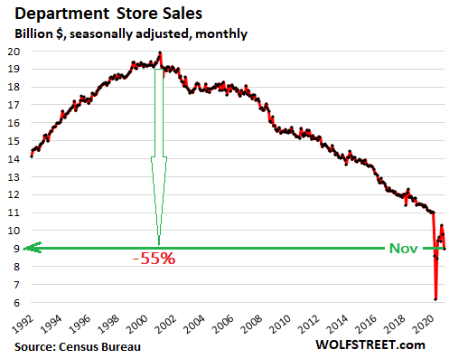 Since the peak in December 2000, department store sales have collapsed by 55%, despite two decades of inflation and population growth, and the Pandemic has merely accelerated the process: