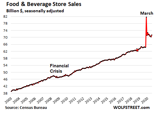 Sales at Food and Beverage Stores, the third largest category, rose 1.6% in November from October to $71 billion (seasonally adjusted) and are up 11.4% from a year ago, given how much consumption has switched to the home from restaurants, cafés, cafeterias, office coffee makers, office vending machines, and office tissue closets: