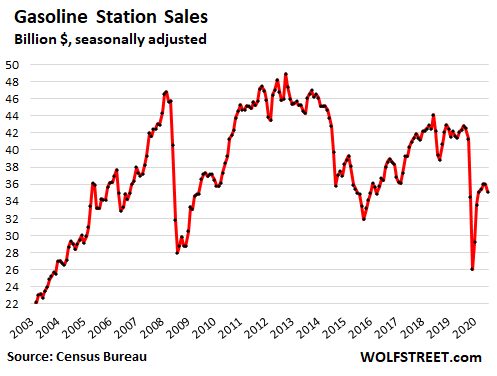 Sales at gas stations – which include snacks, sodas, motor oil, and the like – fell 2.4% in November from October and were down 16% year-over-year. Sales at gas stations move not only with the quantity of fuel sold but also with the highly volatile price of fuel (average price of gasoline was down about 19% in November from a year ago, according to EIA data):