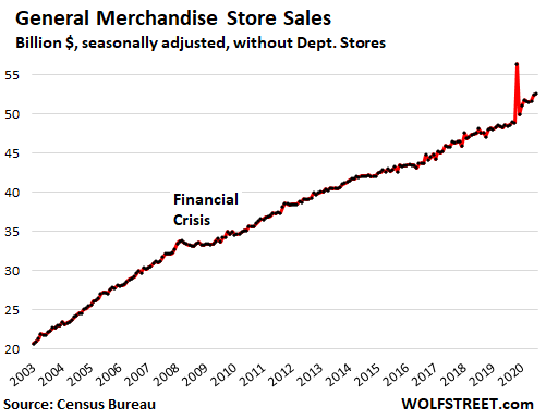 Sales at general merchandise stores (minus department stores) ticked up 0.3% in November from October, to $53 billion, and are up 8.4% from a year ago. The brick-and-mortar stores of Walmart, Costco, and Target are in this category, but their booming ecommerce sales are not; they’re included in ecommerce sales: