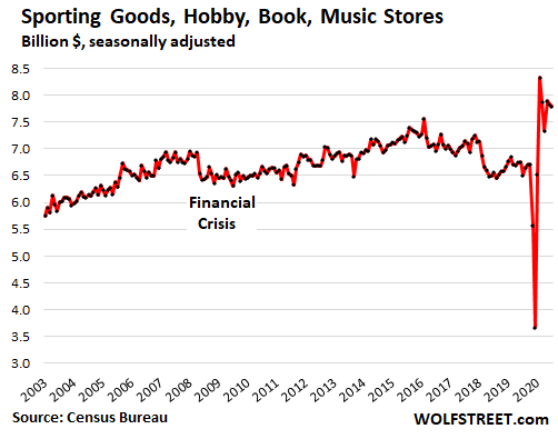 Sales at sporting goods, hobby, book and music stores ticked down 0.6% in November from October, to $7.8 billion, but are up 20% year-over-year. The booming ecommerce businesses that sell these goods, including Amazon, are not included here. This is just what’s left over in terms of sales at brick-and-mortar stores.