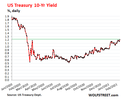The bond market smells a rat, but the mortgage market and the high-yield bond market are holding their nose and plowing forward: The 10-year Treasury yield rose to 1.21% on Friday, the highest since February 26, when markets began their gyrations. This yield has more than doubled (+133%) from the historic low of 0.52% on August 4.